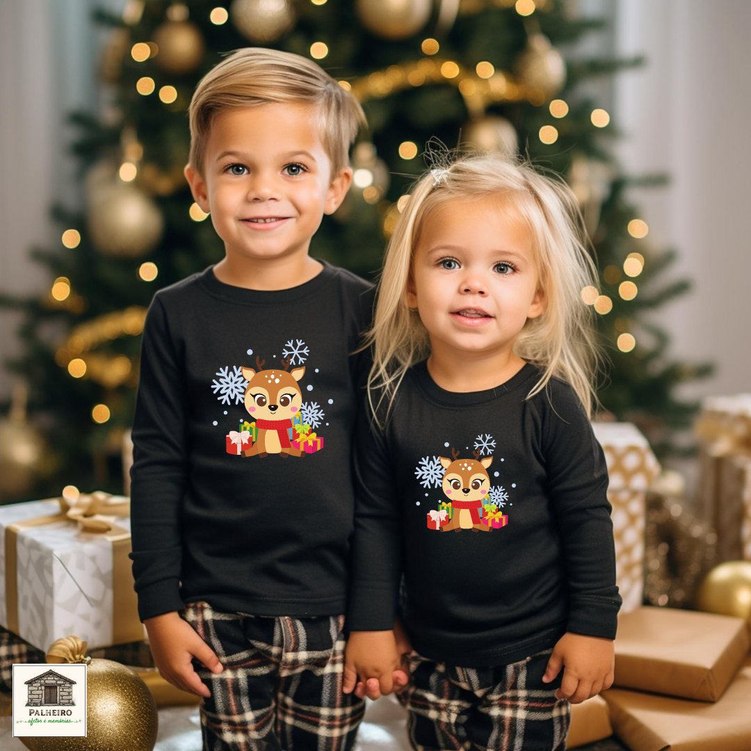 Da coleção Natal, esta peça foi criada para vestir os mais pequenos com alegria, conforto e aquele toque mágico que só o Natal sabe dar. A estampa apresenta uma reninha fofinha rodeada de presentes coloridos — uma cena que parece saída diretamente de um conto natalício.