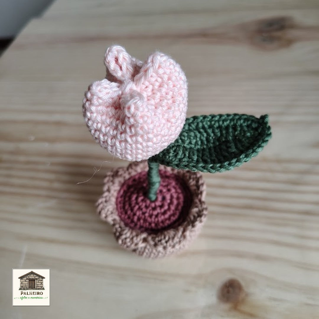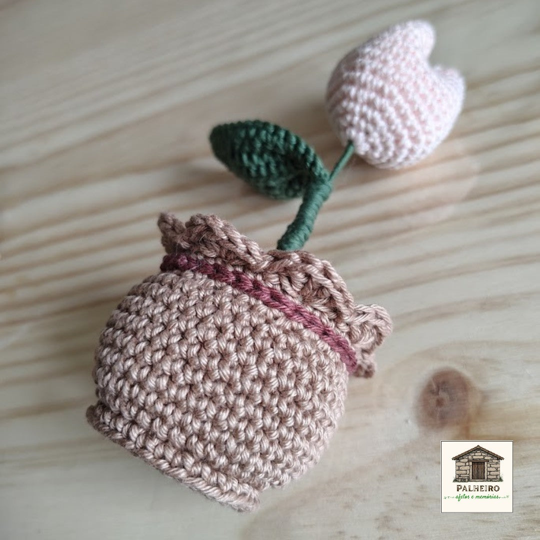 Esta tulipa em croché é uma celebração da simplicidade e da beleza natural. Com cerca de 15 a 16 cm de altura, cada flor é feita à mão com cuidado e carinho, plantada num vasinho de croché que lhe confere estabilidade e charme.