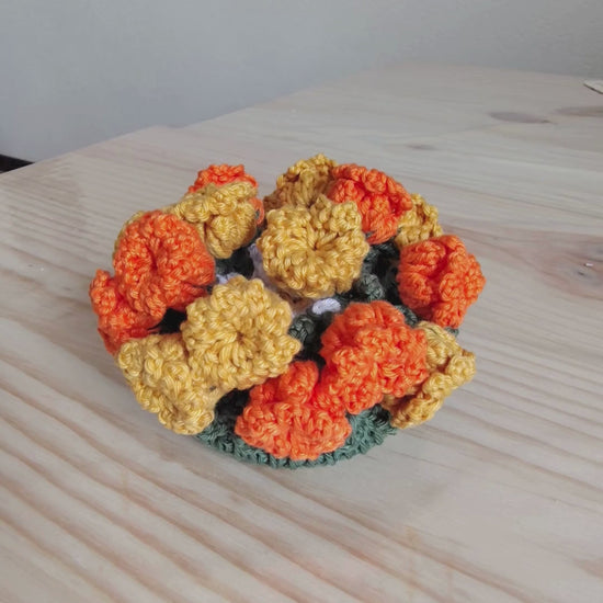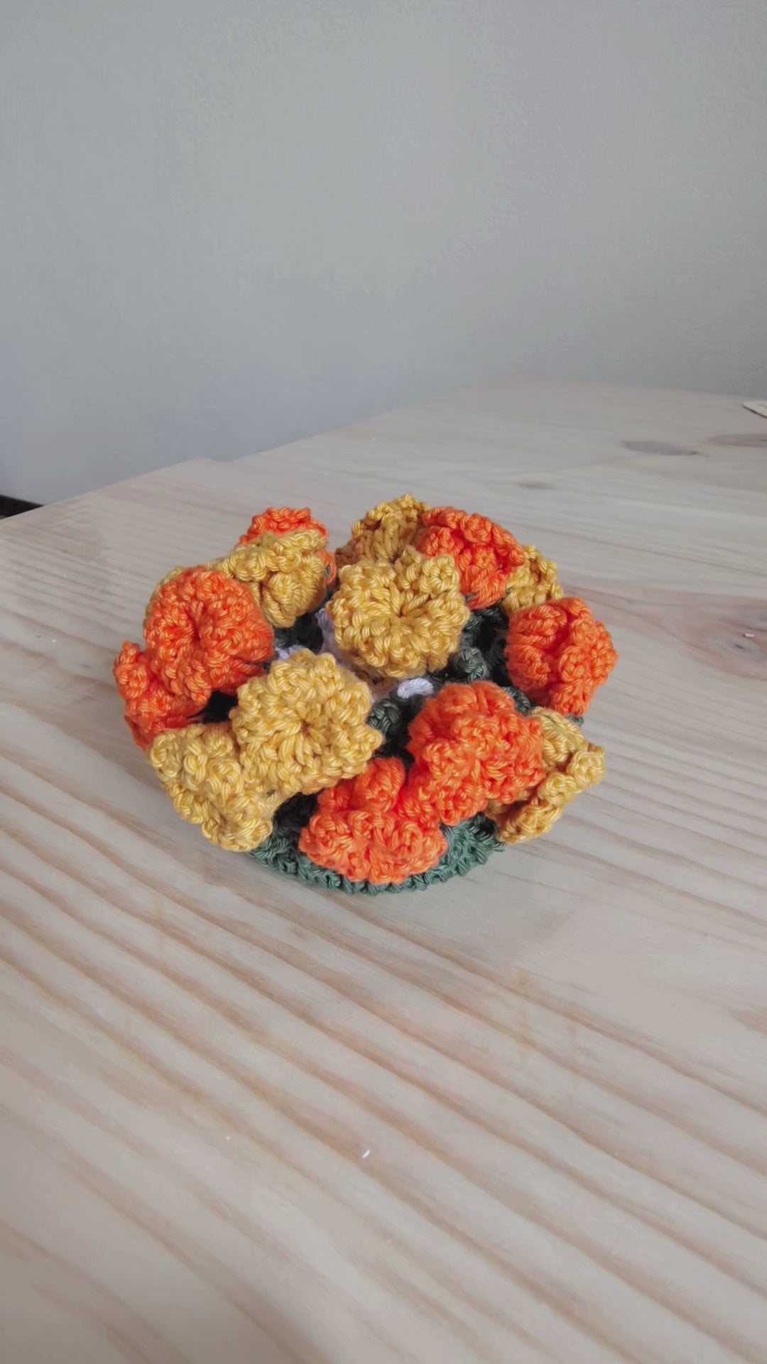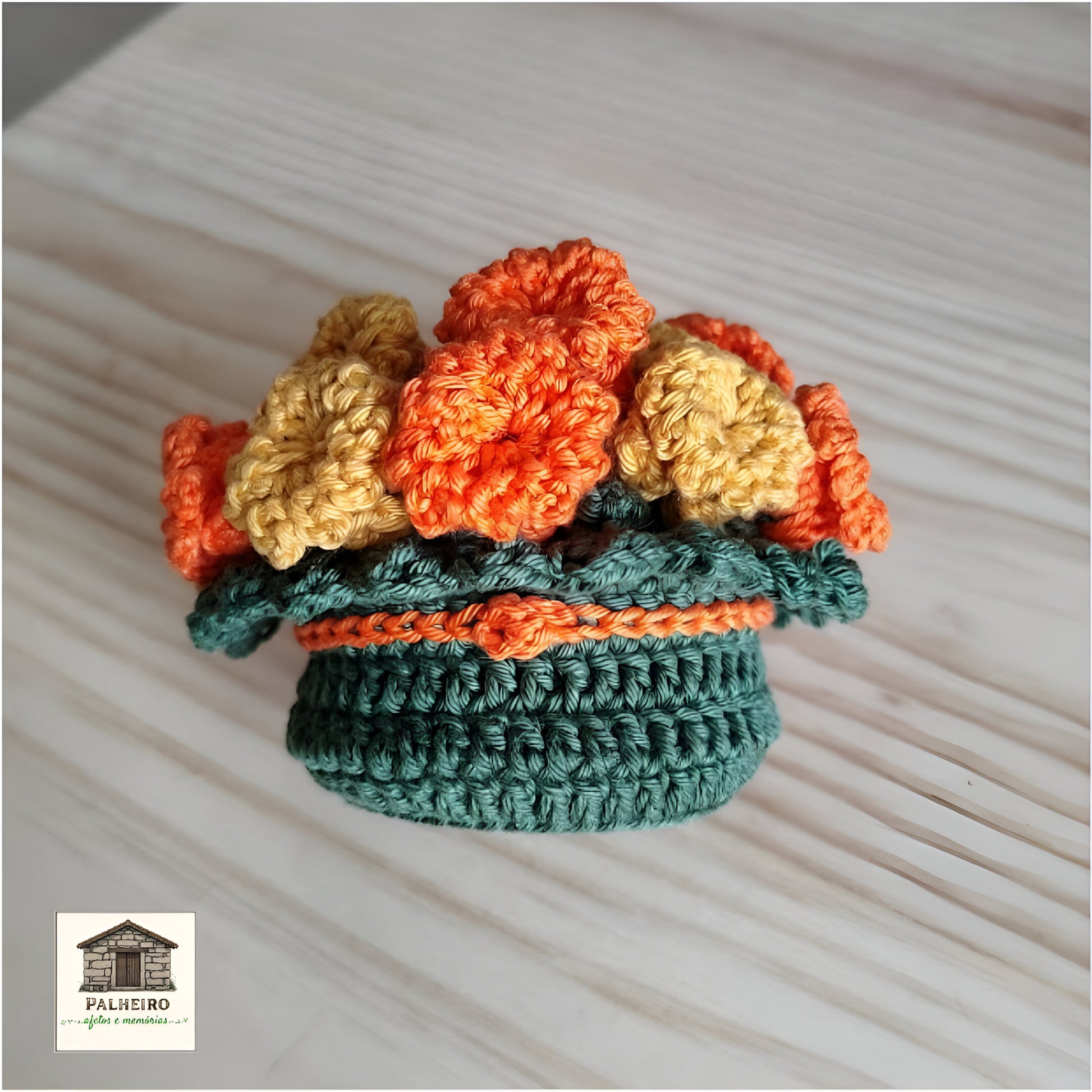 Cada flor é feita à mão com atenção ao detalhe, e o vasinho em croché dá estabilidade e elegância à composição. Ideal para quem procura uma decoração delicada ou um presente criativo e original.